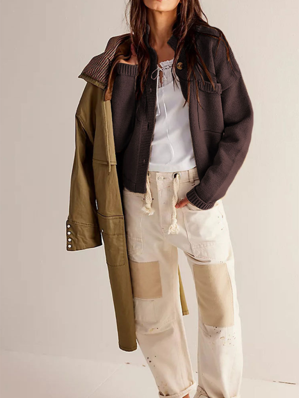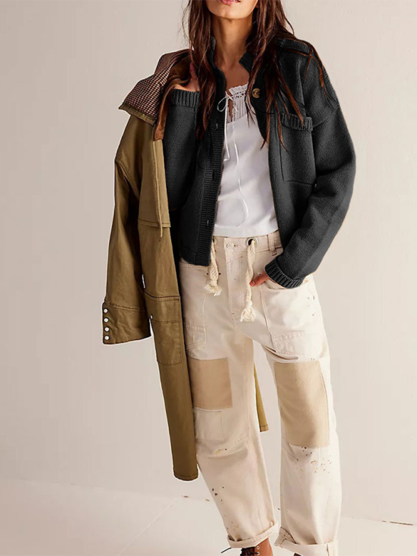 Women's Knit Jacket Standing Collar Solid Color Cardigan Sweater